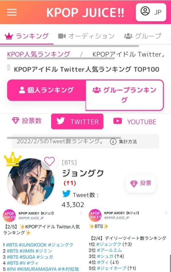 정국은 일본 내 K팝 아이돌 인기 랭킹 투표 사이트 '케이팝 주스'(KPOP JUICE)에서 '트위터' 인기 순위 1위를 차지했다.