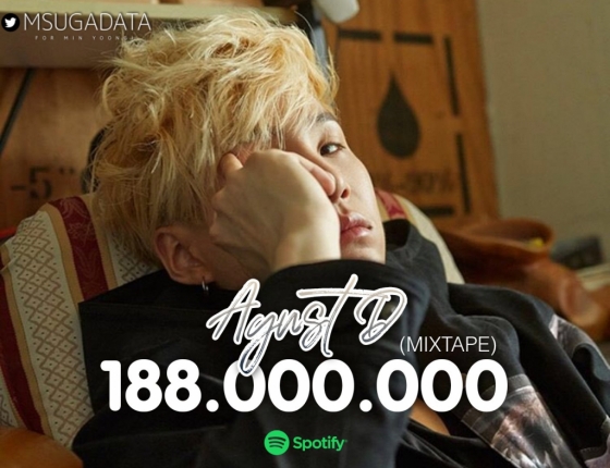 2016년 8월 16일 슈가가 'Agust D'라는 이름으로 발매한 빅히트 엔터테인먼트 레이블 첫 번째 믹스 테이프 'Agust D'는 2월 9일(한국시간) 세계 최대 음원 플랫폼 스포티파이에서 1억 8800만 스트리밍을 넘어섰다.