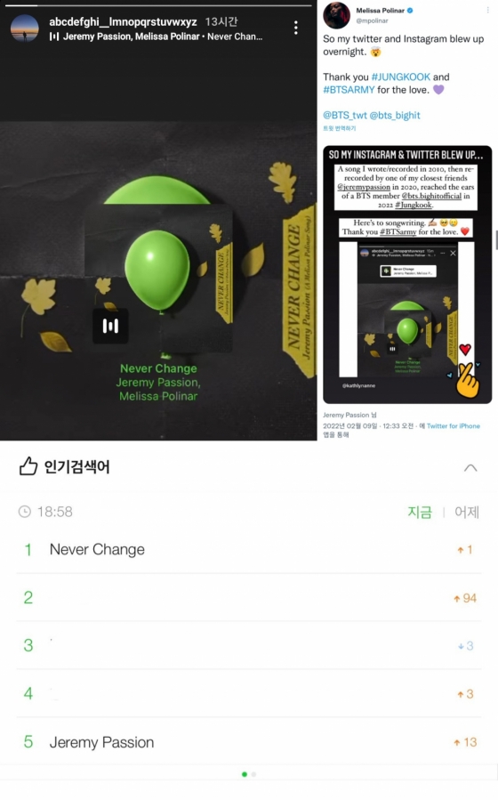 정국은 지난 8일 자신의 인스타그램스토리를 통해 미국 싱어송라이터 제레미 패션(Jeremy Passion), 멜리나 폴리나(Melissa Polinar)의 'Never Change'를 추천곡으로 공유했다.