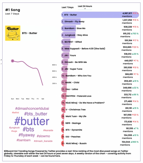 'Stay Alive'는 12일 오후 9시30분 현재 빌보드 핫 트렌딩 송즈 차트 24시간 이내 기준 리얼타임 차트에서 4위를 달리고 있다. 1위는 방탄소년단 'Butter'가 굳건하게 버티고 있다는 점도 함께 눈길을 끌고 있다.