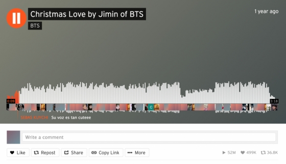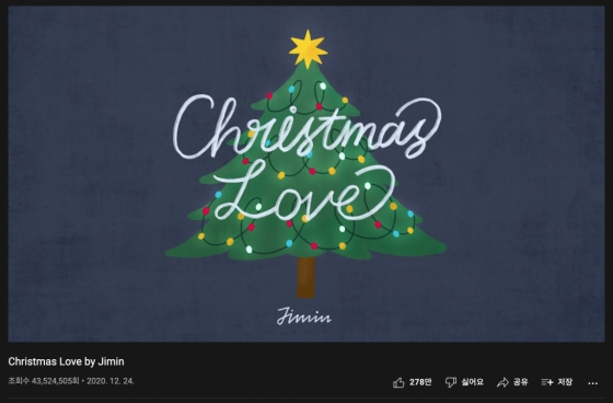 톱 아이돌그룹 방탄소년단(BTS, RM 진 지민 제이홉 슈가 뷔 정국) 멤버 지민 자작곡 '크리스마스 러브'(Christmas Love)가 사운드클라우드 누적 5200만 스트리밍을 돌파에 성공하면서 크리스마스 시즌이 아님에도 여전히 인기를 끌고 있다. 이로써 '크리스마스 러브'는 사운드클라우드 유튜브 누적 1억 스트리밍 달성에 더욱 다가섰다.
