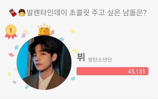 뷔는 지난해에도 해당 투표에서 1위에 등극한 바 있어 2년 연속 밸런타인데이에 고백하고 싶은 아이돌에 올랐다.