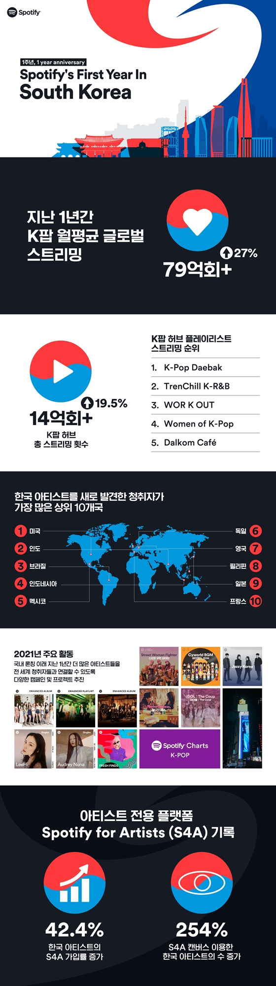 스포티파이의 아티스트·창작자 전용 플랫폼인 '스포티파이 포 아티스트(Spotify for Artists; S4A)'의 한국 아티스트 가입률도 국내 론칭 전 보다 42.4% 증가한 것으로 나타났다.