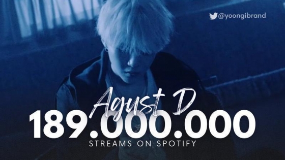 2016년 8월 16일 슈가가 'Agust D'라는 이름으로 발매한 빅히트 엔터테인먼트 레이블 첫 번째 믹스 테이프 'Agust D'는 2월 16일(한국시간) 세계 최대 음원 플랫폼 스포티파이에서 1억 8900만 스트리밍을 넘어섰다.
