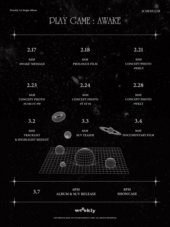 IST엔터테인먼트 측은 16일 0시 위클리 공식 SNS 채널 등지를 통해 위클리의 첫 번째 싱글앨범 'Play Game : AWAKE(플레이 게임 : 어웨이크)'의 스케줄러 이미지를 공개했다.