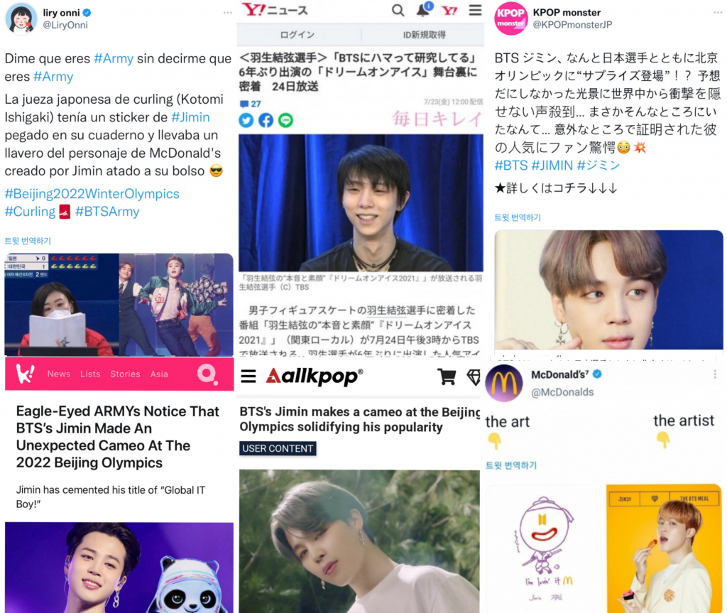 방탄소년단(BTS) 지민이 동계 올림픽 선수들의 원픽으로 곳곳에 등장하며 사랑받고 있어 화제다.