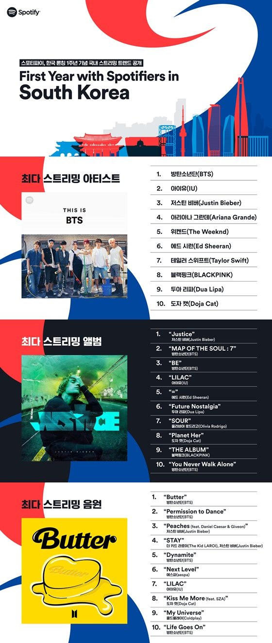 국내 스포티파이어들이 가장 많이 청취한 음원도 방탄소년단이었다. '버터(Butter)', '퍼미션 투 댄스(Permission to Dance)', '다이너마이트(Dynamite)'로 가장 많이 청취한 음원 1위, 2위, 5위에 이름을 올렸다.