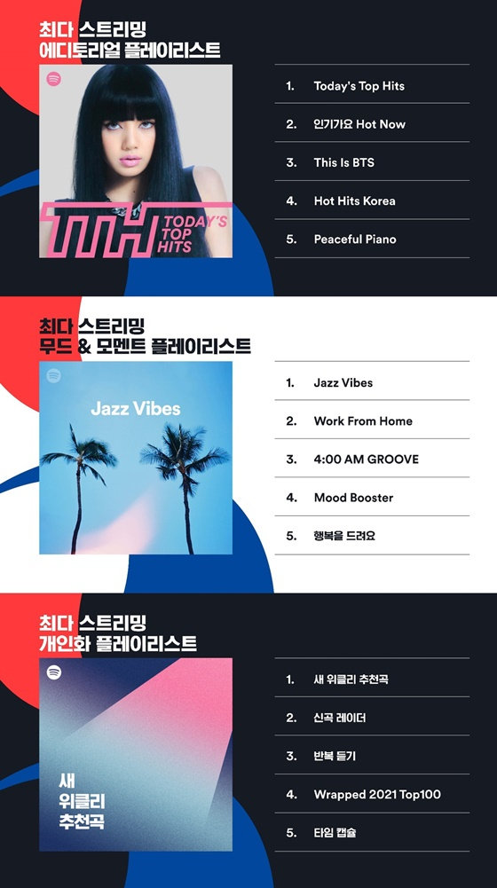 플레이리스트에서도 방탄소년단의 인기가 빛났다. 스포티파이 뮤직팀이 직접 큐레이팅한 에디토리얼 플레이리스트 상위 3위는 'Today's Top Hits', '인기가요 Hot Now', 'This Is BTS' 순으로 나타났다. 방탄소년단의 음악만을 다룬 'This Is BTS'가 이름을 올렸다는 점이 눈길을 끈다. 아울러 기분 및 상황에 맞는 음악을 추천하는 무드 & 모멘트(Mood & Moments) 플레이리스트 중에서는 'Jazz Vibes', 'Work From Home', '4:00 AM GROOVE'가 순서대로 최다 스트리밍을 기록했다.