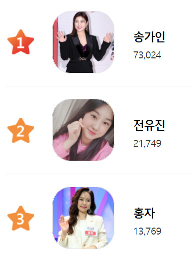 이번 랭킹에서 1위는 7만 3024표를 얻은 송가인이 차지했다. 2위 전유진 뒤를 이은 3위 홍자는 1만 3769표를 기록해 이름을 올렸다. 김다현은 1만2606표, 김태연은 1만1808표로, 각각 4위와 5위를 차지했다.
