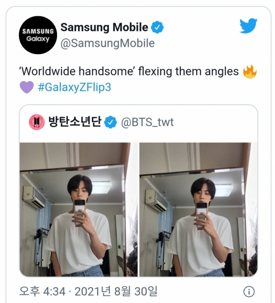 삼성 모바일 공식 계정은 "'월드와이드핸섬'의 다양한 각도에서 뽐내기 (Worldwide handsome' flexing them angles)"라는 문구와 함께 진의 셀카를 리트윗했다.