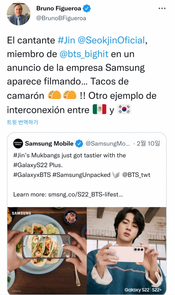 주 대한민국 멕시코 대사인 브루노 피게로아(Bruno Figueroa)는 삼성 모바일(Samsung Mobile) 공식 트위터 계정이 "JIN의 먹방이 Galaxy S22 Plus로 더욱 맛있어졌습니다"라는 글과 함께 게시한 진의 화보를 리트윗했다.