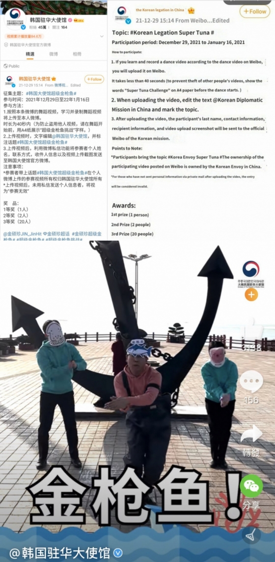 지난해 12월에는 주 중국 대한민국 대사관이 상품을 걸고, 전 세계적 신드롬을 일으킨 '슈퍼참치(Super Tuna)' 챌린지 이벤트를 열었다.