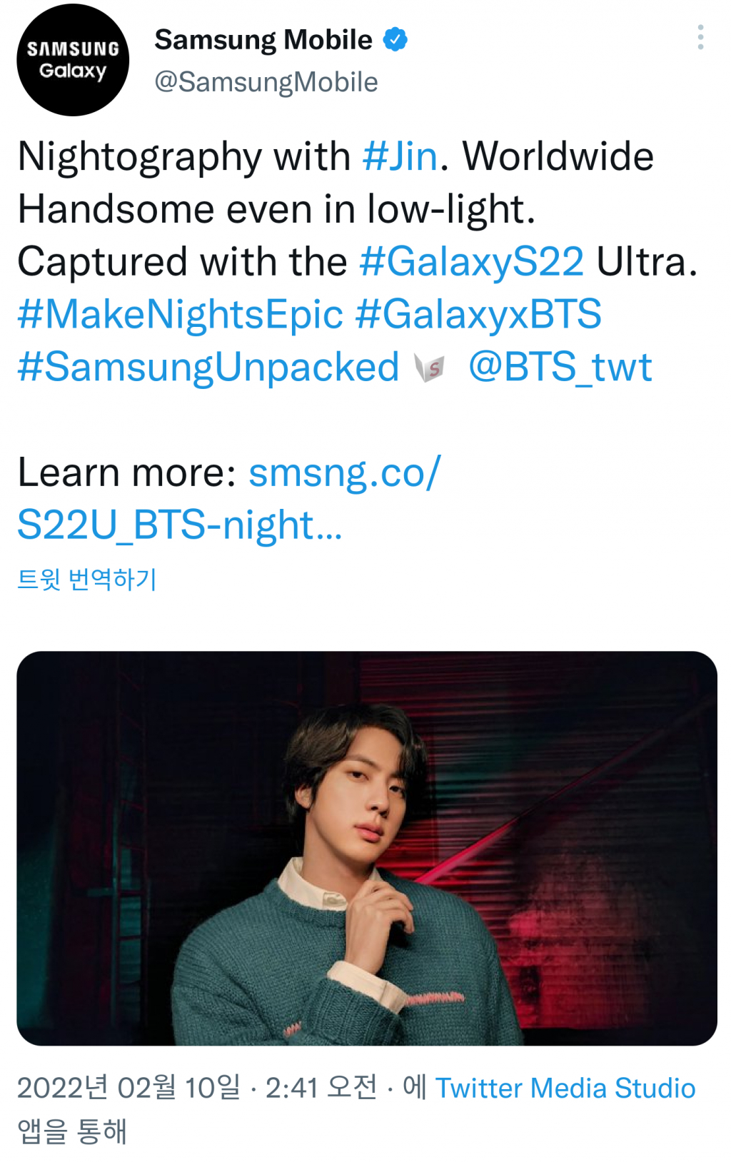 한편 삼성 모바일 공식 계정은 최근 "JIN과 함께하는 야간촬영. 저조도에서도 월드와이드 핸섬. Galaxy S22 Ultra로 촬영"이라는 글과 함께 진의 다른 화보를 공개하며 미의 남신이라고 불리는 진의 환상적인 미모에 찬사를 보내기도 했다.