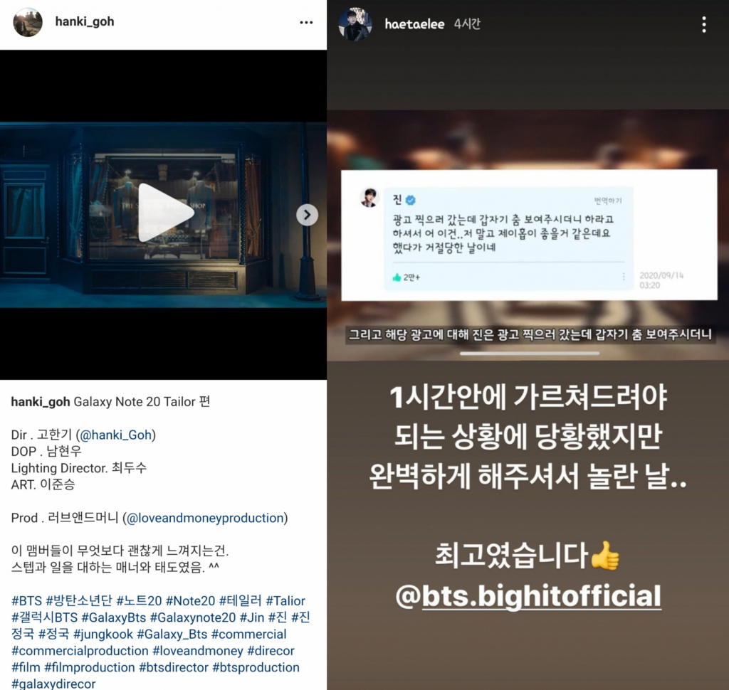 삼성 'The Strange Tailor Shop' 편을 촬영하기도 한 고한기 감독은 자신의 인스타그램 계정에 해당 광고 영상과 함께 진과 정국의 해시태그를 남기며 "이 멤버들이 무엇보다 괜찮게 느껴지는 건. 스탭과 일을 대하는 매너와 태도였음^^"이라는 글을 게시한 바 있다.