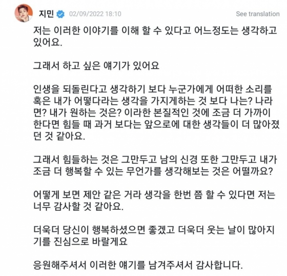지민은 최근 팬 커뮤니티 위버스(Weverse)를 통해 힘들고 고통스러운 시간을 겪고 있다는 한 팬에게 조심스런 말투로 충분히 이해할 수 있다며, 자신의 경우를 예를 들어 먼저 위로를 전한 뒤 "힘들어하는 것은 그만두고, 남의 신경 또한 그만두고 내가 조금 더 행복할 수 있는 무언가를 생각해보는 것은 어떨까요?"라며 조심스레 조언했다.
