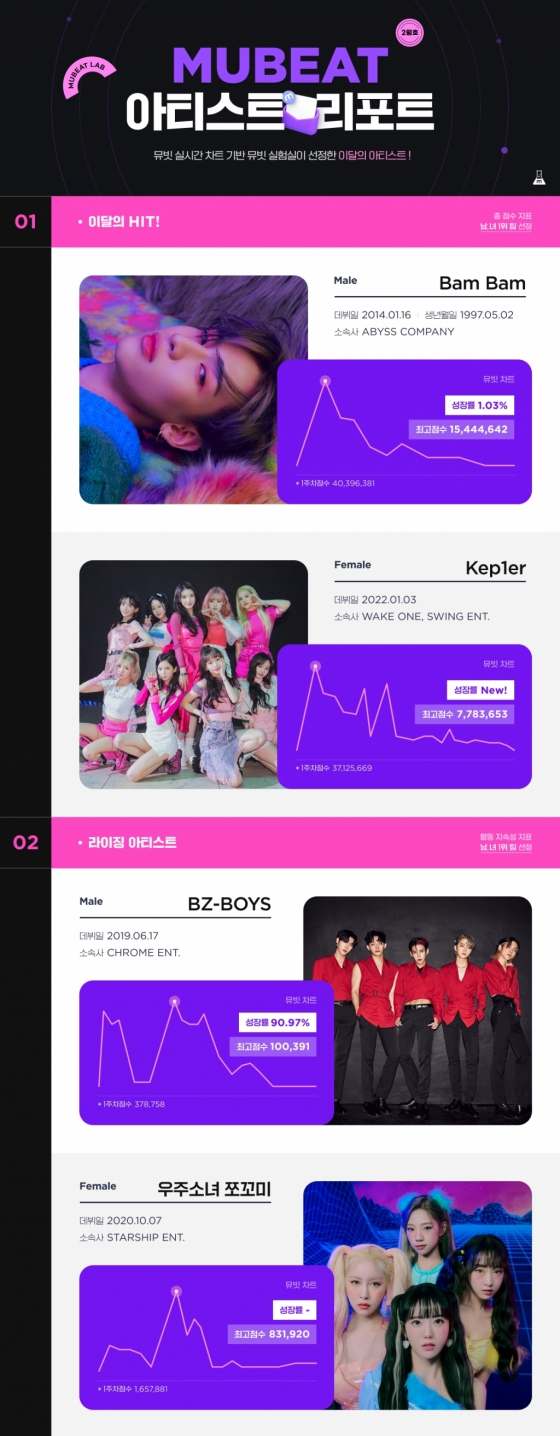 글로벌 팬덤 플랫폼 뮤빗의 팬덤실험실이 지난 한 달 간의 성과 데이터를 분석한 '아티스트 리포트' 2월 호를 발표했다. 이에 따르면 이달의 HIT 아티스트로는 뱀뱀(Bam Bam)과 케플러(Kep1er)가, 라이징 아티스트로는 우주소녀 쪼꼬미(WJSN CHOCOME)와 청공소년(BZ-BOYS)이 선정됐다.