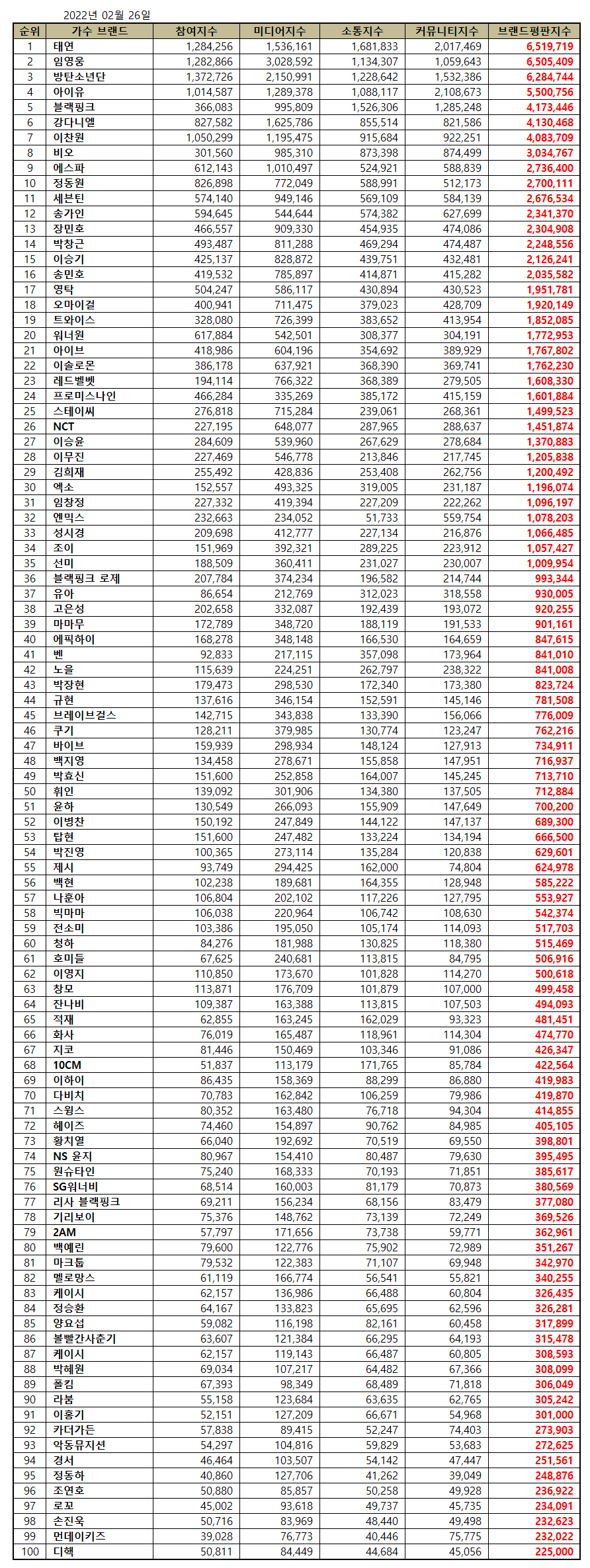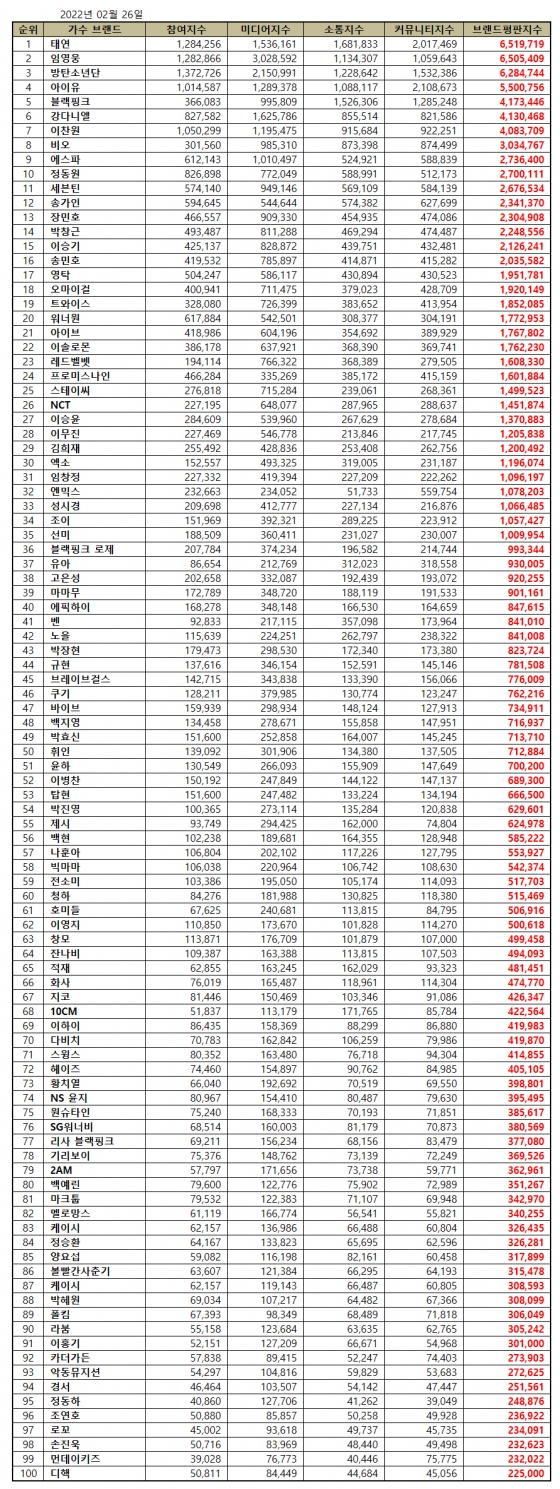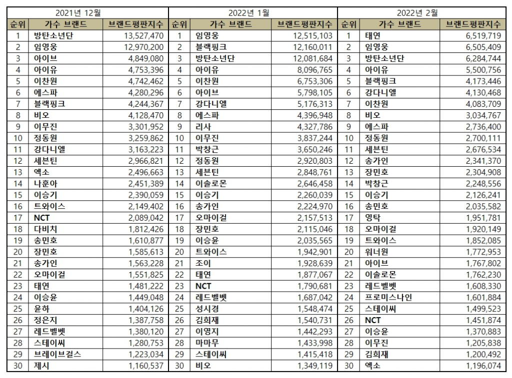 2022년 2월 가수 브랜드평판 30위 순위는 태연, 임영웅, 방탄소년단, 아이유, 블랙핑크, 강다니엘, 이찬원, 비오, 에스파, 정동원, 세븐틴, 송가인, 장민호, 박창근, 이승기, 송민호, 영탁, 오마이걸, 트와이스, 워너원, 아이브, 이솔로몬, 레드벨벳, 프로미스나인, 스테이씨, NCT, 이승윤, 이무진, 김희재, 엑소 순으로 분석됐다.