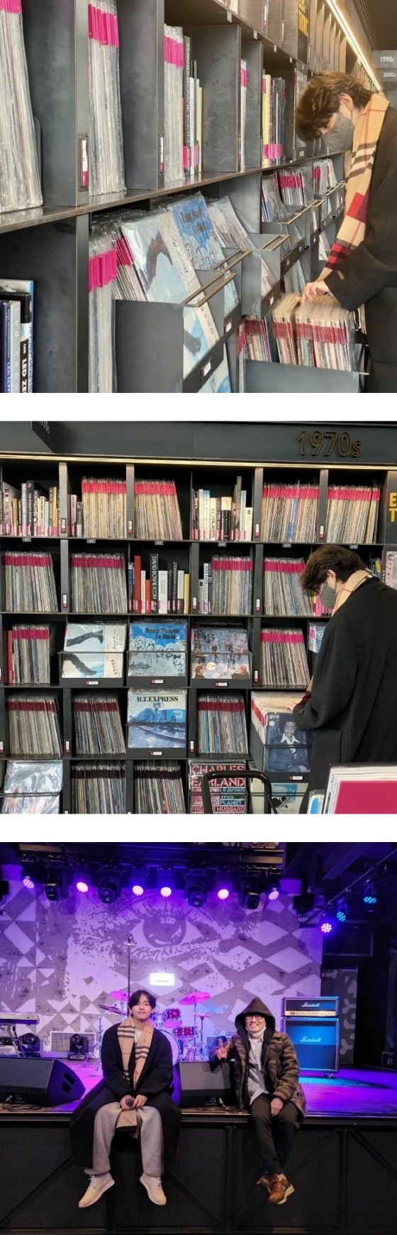 공개된 사진에는 뷔가 '토일렛페이퍼'(TOILETPAPER)의 'Toiletpaper: The Studio' 전시회와 공연장을 둘러보고 LP를 구경하며 여유로운 한 때를 보내는 모습이 담겼다.