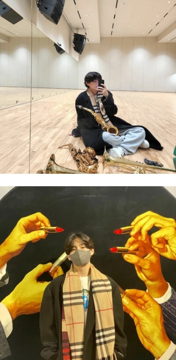 다음으로 뷔는 연습실에서 트럼펫과 색소폰을 앞에 두고 거울을 보면서, 방탄소년단이 홍보대사로 활동하고 있는 삼성 휴대폰으로 셀카를 찍는 사진을 공개했다. 뷔는 지난해부터 트럼펫을 배우기 시작했으며 연주하는 모습의 영상을 공개하기도 했다. 색소폰 역시 뷔가 어린 시절부터 배운 악기다. 사진 속 여러 대의 악기로 보아 뷔가 악기연습을 하는 것으로 유추돼 팬들의 기대감을 높였다.