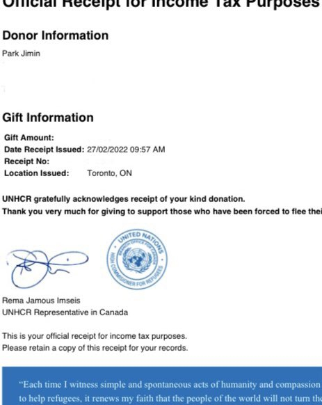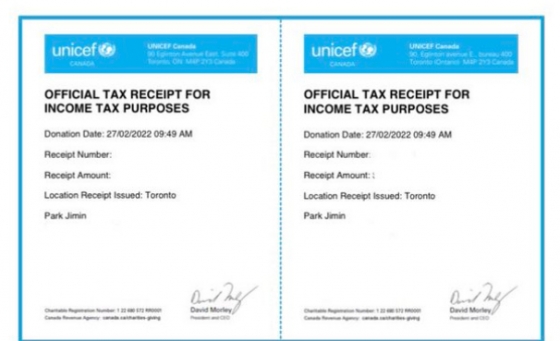 지민의 캐나다 팬베이스인 'JIMIN UNITED'는 '우크라이나의 어린이들을 돕기 위해 '박지민(PARK JIMIN)의 이름으로 유엔난민기구'(@UNHCRCanada)와 '유니세프캐나다(@UNICEFCanada)에 기부했다'고 알렸다.