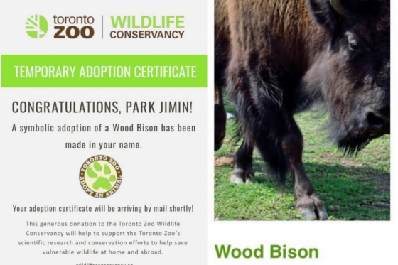 이번에도 지민의 솔로곡 '필터'와 첫 프로듀싱 곡인 '친구'의 발매 2주년을 기념하며 ' 토론토 동물원 야생동물보호소(@TZWConservancy)의 동물 프로그램 입양 프로그램을 통해 나무 들소(Wood Bison)을 박지민(PARK JIMIN)의 이름으로 입양했다'고 밝혀 다양한 분야에서의 기부 활동을 이어가고 있다.