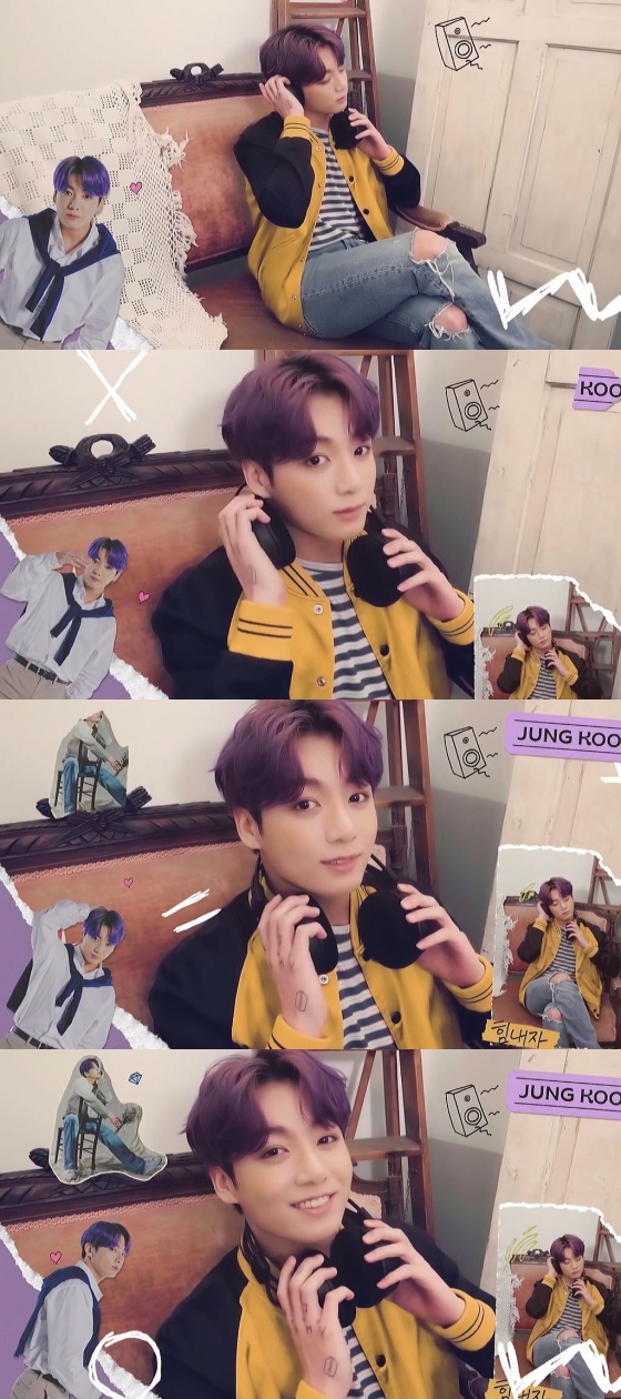 정국은 보라 머리를 한 채 이어폰을 귀에 대고 노래를 들으며 청춘 만화를 찢고 나온 청량한 남자 주인공의 매력을 한껏 발산하며 여심을 설레게 했다.