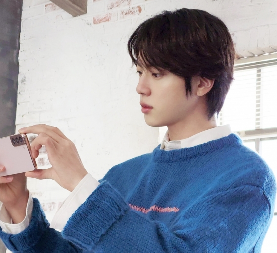 자연스러운 흑발 헤어와 검은색 패딩 착장으로 물고기를 든 채 기뻐하는 표정의 진은 꾸미지 않았어도 살아 숨쉬는 보석처럼 눈부신 미모를 감출 수 없는 모습이다.