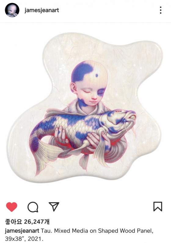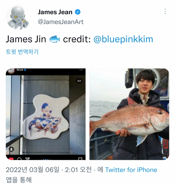 자신의 이름인 'James Jean'이 아니라 'James Jin', 즉 방탄소년단 진의 이름 표기인 'Jin'과 글로벌 신드롬을 일으킨 진의 '슈퍼참치'(Super Tuna)가 연상되는 물고기 이모티콘을 함께 덧붙여 재치있게 진에 대한 애정을 드러냈다.
