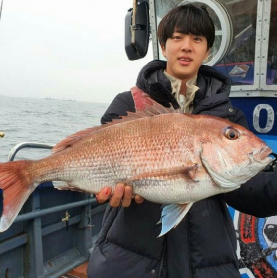 진의 사진은 만선을 기원하는 자작곡 '슈퍼참치'를 만들 정도로 그가 사랑하는 취미인 낚시를 즐기러 바다를 갔을 때 찍은 것으로, 매우 큰 참돔을 들고 있다.