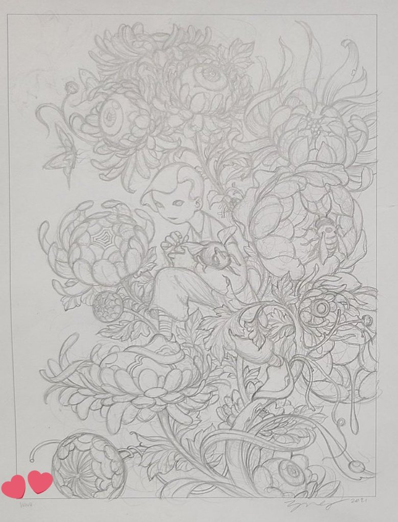 가장 핫하다고 평가받고 있는 세계적 미술가 제임스 진(James Jean)은 최근 자신의 공식 트위터 계정에 자신의 작품과 진의 사진을 나란히 게재했다.