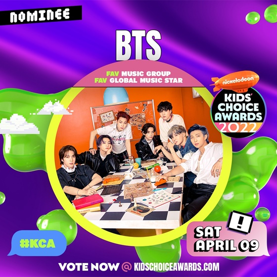 10일(이하 현지시간) 미국 엔터테인먼트 채널 니켈로디언(Nickelodeon)이 공식 홈페이지를 통해 발표한 '2022 키즈 초이스 어워드(Kids Choice Awards)' 수상 후보 명단에 따르면, 방탄소년단은 '페이보릿 뮤직 그룹(Favorite Music Group)'과 '페이보릿 글로벌 뮤직 스타(Favorite Global Music Star)' 등 2개 부문에 이름을 올렸다.