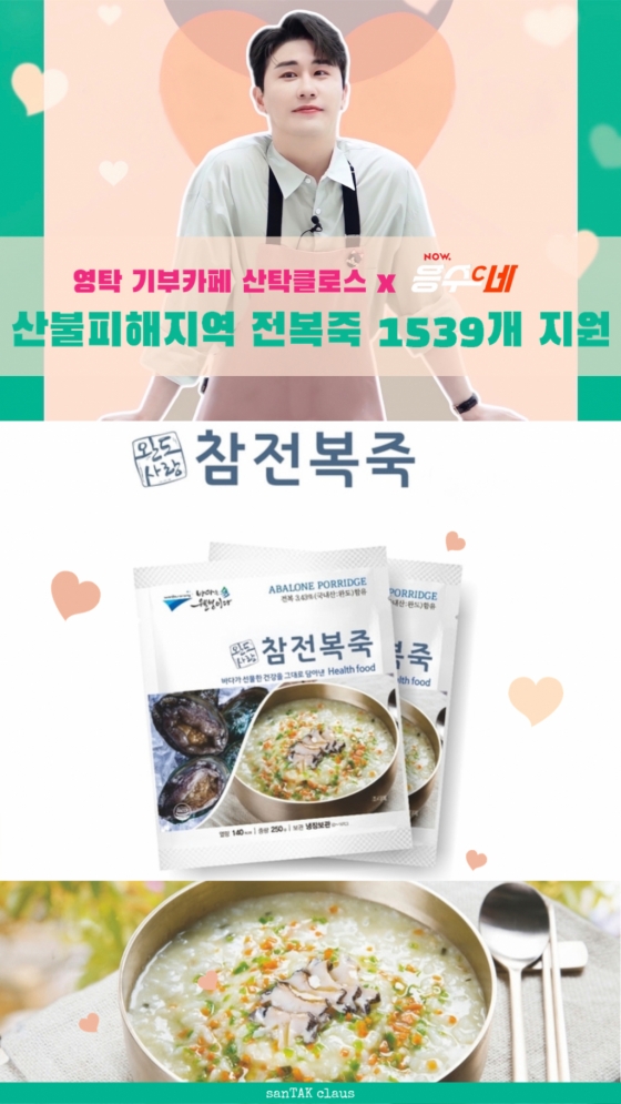 '산탁클로스'는 "수많은 팬들의 자발적인 참여로 총 1539인분의 전복죽을 산탁클로스 x 응수c네 이름으로 소중하게 전달할 수 있게 됐다"며 "전북죽 한 그릇마다 이재민 여러분의 건강을 빌고 하루빨리 보금자리가 복구되기를 소망하는 마음을 담아드린다"고 완도산 전복과 철원 오대쌀로 정성껏 끓인 '완도사랑 참전복죽'을 전달했다.
