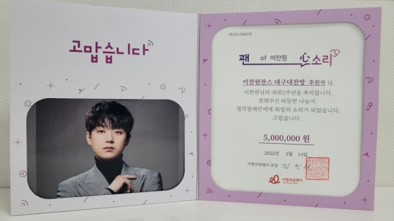가수 이찬원의 데뷔 2주년을 맞아 팬들이 뜻깊은 기부로 의미를 더했다.