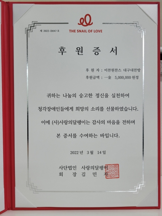 이찬원 '대구대찬방' 찬스는 3월 14일 이찬원 데뷔 2주년 기념일을 맞아 뜻깊고 의미 있는 일에 동참하고자 '희망을 나눕니다 내일을 듣습니다' 사랑의달팽이 팬심소리 기부에 참여했다.