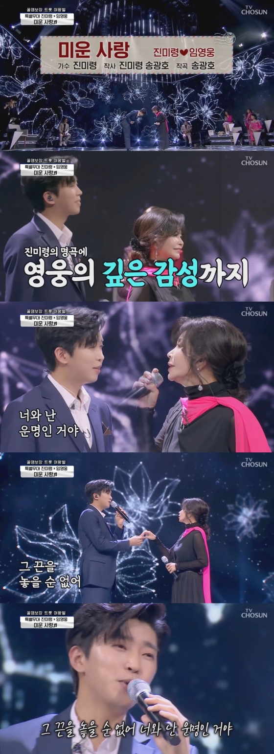 영상에는 임영웅이 선배 가수 진미령과 환상의 하모니를 맞추는 모습이 담겼다.