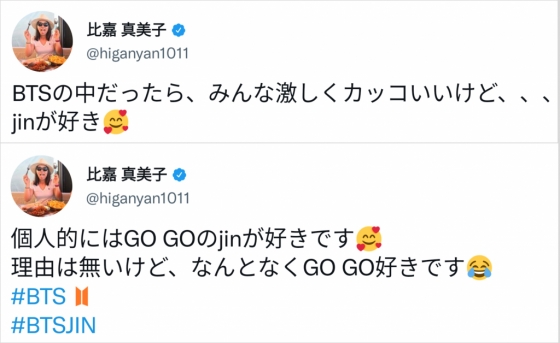 일본 프로골퍼 히가 마미코(比嘉 ?美子)는 최근 자신의 공식 트위터 계정을 통해 "BTS 안에서라면 모두 격하게 멋있지만... jin이 좋아요"라는 글과 함께 하트에 둘러싸인채 웃고 있는 이모티콘을 남겨 애정을 표현했다.