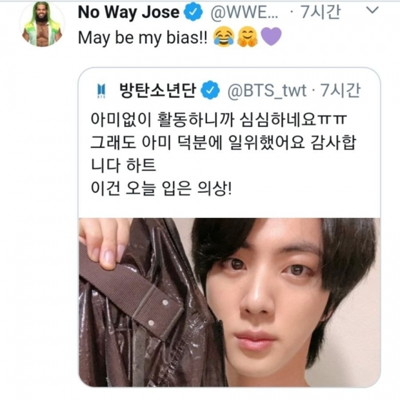 WWE 선수 노 웨이 호세(No Way Jose, 본명 Levis Valenzuela Jr.)는 진이 아미(방탄소년단의 팬들)에게 1위 감사 인사를 하며 남긴 셀카를 리트윗하며 "아마도 나의 최애"라는 글과 보라색 이모티콘 등으로 애정을 드러낸 바 있다.