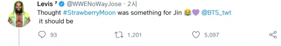 노 웨이 호세는 또 #StrawberryMoon은 진을 위한 것이라고 생각했다며 웃고 우는 이모티콘과 보라색 이모티콘으로 사랑을 나타냈다.