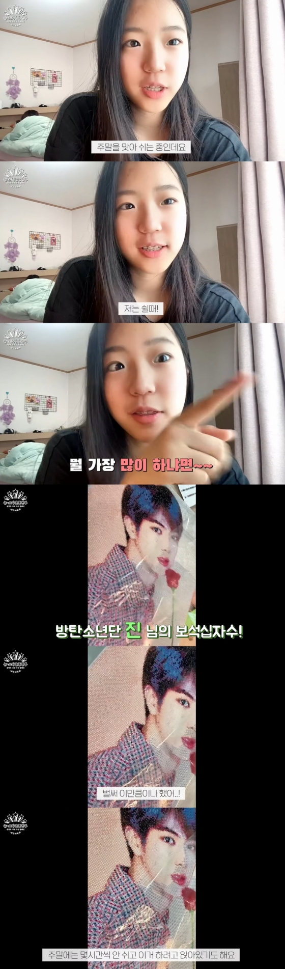신유빈은 "벌써 이만큼이나 했어! 주말에는 몇 시간씩 안쉬고 이거 하려고 앉아 있기도 해요"라며 진을 향한 애정을 드러냈다.