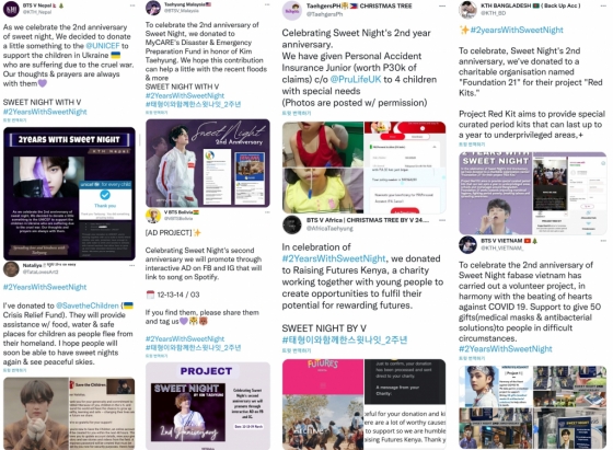네팔 팬베이스 'BTS V Nepal'은 잔혹한 전쟁으로 고통받는 우크라이나 아이들을 위해 '유니세프'에 기부했고, 팬 계정 'Nataliya'는 세이브더칠드런의 '우크라이나 위기 구호 기금'에 기부하며 "사람들이 곧 다시 달콤한 밤(Sweet Night)을 보내고 평화로운 하늘을 볼 수 있기를 바란다"고 전했다.