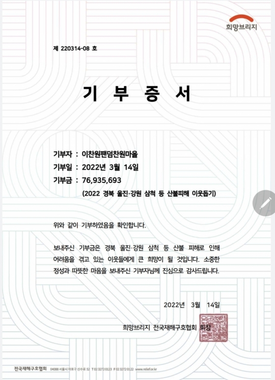 '찬원마을'은 "갑작스러운 화마로 삶의 터전을 잃고 어려움에 처한 경북 울진, 강원 삼척 주민들이 희망을 잃지 않고, 꼭 힘을 내시길 기원한다"며 "어려운 시기에 함께 뜻을 모으고, 이를 통해 작은 위로를 전할 수 있음에 감사하다"고 전했다.