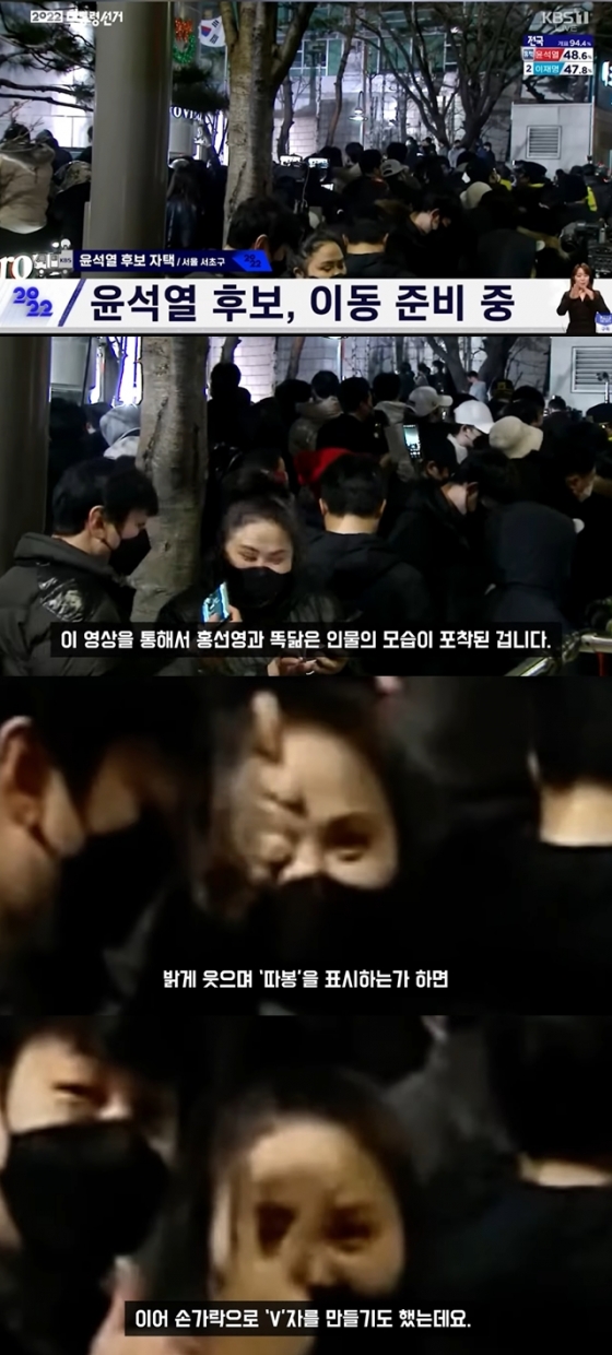 이진호는 "KBS는 윤석열 당선인의 자택과 지지자들의 모습을 현장 영상을 통해 라이브로 송출했다"며 "이 영상을 통해 홍선영과 똑닮은 인물의 모습이 포착됐다"고 설명했다.