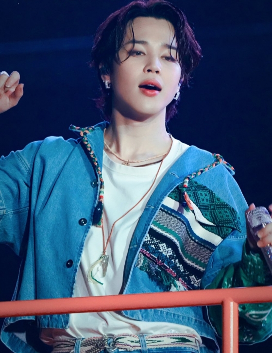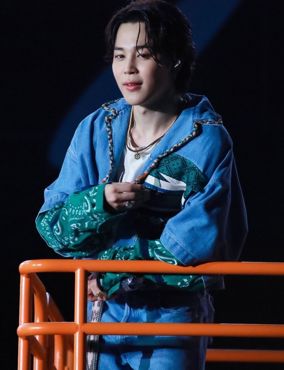 지민은 지난 10일과 12일~13일 개최된 'BTS 퍼미션 투 댄스 온 스테이지 - 서울'에서 화이트 반팔 티셔츠에 페이즐리 무늬가 매치된 에스닉한 데님 재킷과 청바지를 착용, 본연의 우아하고 고혹적 비주얼에 청량하면서 러블리한 매력까지 더해 큰 호응을 모았다.