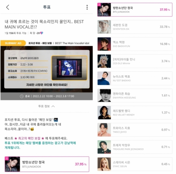 정국은 2월 22일부터 3월 8일까지 아이돌챔프에서 진행된 '내 귀에 흐르는 것이 목소리인지 꿀인지..BEST MAIN VOCAL은?' 설문에서 1위를 차지했다.
