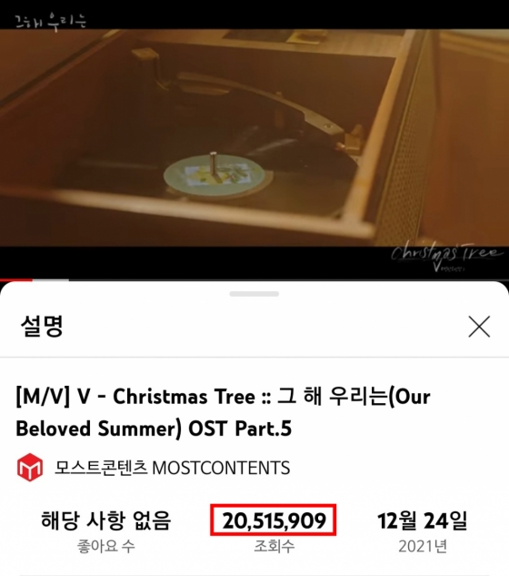 방탄소년단(BTS) 뷔의 'Christmas Tree' 뮤직비디오가 유튜브 조회수 2000만뷰를 돌파했다.