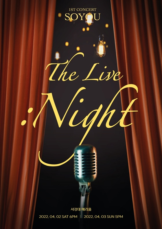 17일 소속사 빅플래닛메이드에 따르면 소유는 오는 4월 2일과 3일 양일간 서강대학교 메리홀에서 첫 단독 콘서트 'THE LIVE : NIGHT(더 라이브 : 나잇)'을 개최한다.