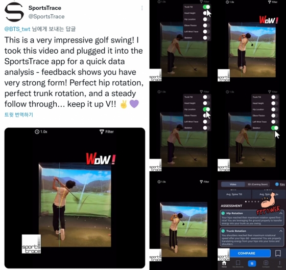 스포츠 트레이스는 앱을 통해 뷔의 스윙을 자세히 분석했다. "뷔의 자세는 매우 강한 폼을 보여주고 있으며, 완벽한 힙 회전, 완벽한 몸통 회전은 물론이고 팔로우 스루(follow-through)도 안정적으로 해내고 있는 것으로 분석됐다"고 덧붙였다. 이어 뷔가 계속 열정을 가지고 열심히 하기를 응원하며 그가 골프 스윙 영상을 추가로 게시하길 희망했다.