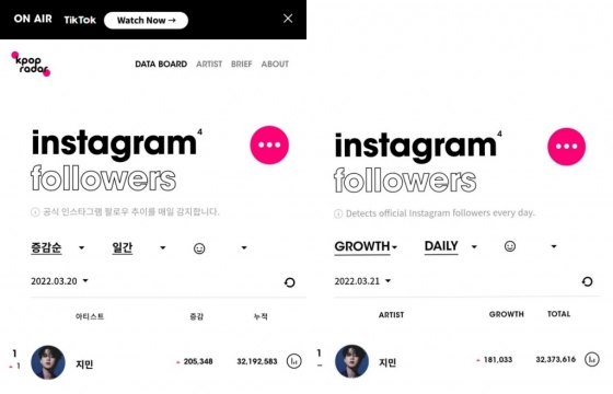K팝 팬덤 데이터를 집계하는 스페이스 오디티의 '케이팝 레이더'에 따르면 지민이 19일 자신의 인스타그램에 사진을 공개한 이후 20만명 이상의 팔로워를 모은 것으로 나타났다.