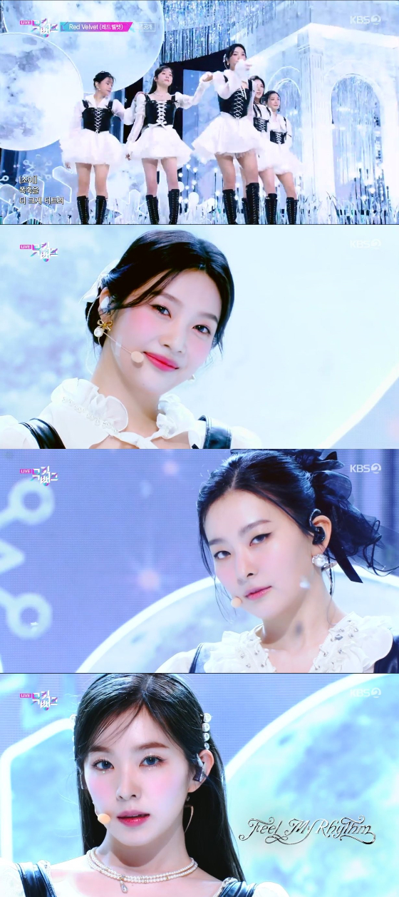 이날 방송에서 레드벨벳은 흰색 프릴 드레스에 가죽 부츠를 신고 새 미니앨범 타이틀 곡 'Feel My Rhythm'(필 마이 리듬)을 최초로 선보였다. 레드벨벳의 나비를 형상화 한 안무와 다채로운 퍼포먼스로 시선을 사로잡았다.