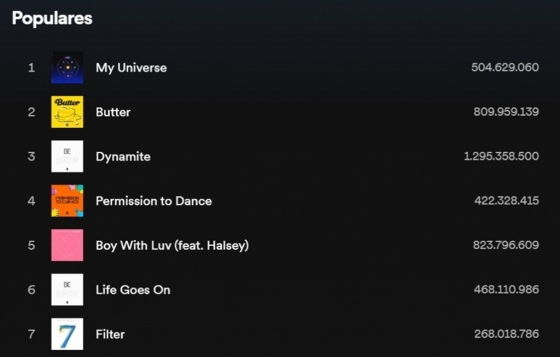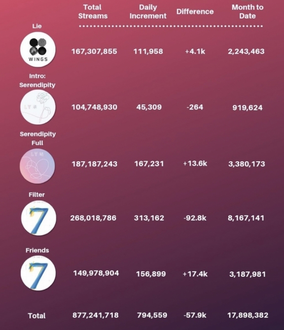 한편 22일 스포티파이 기록에 따르면 '필터'는 31만 3162 스트리밍을 기록해 전체 2억 6801만 8786 스트리밍을 넘어 방탄소년단 '인기곡 Top 10' 차트에서 7위를 차지하며 솔로곡 최고 순위에 올라 멈출줄 모르는 '필터' 인기를 실감케하며 솔로 음원 최강자 다운 면모를 보여줬다.